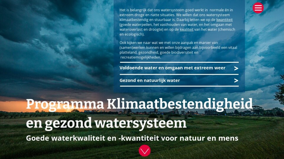 Het is belangrijk dat ons watersysteem goed werkt in normale én in extreem droge en natte situaties. We willen dat het watersysteem klimaatbestendig en stuurbaar is. Daarbij letten we op de hoeveelheid water en op de kwaliteit van het water. Er zijn veel aanpassingen in het watersysteem nodig om grote problemen bij droogte te voorkomen en de kans op wateroverlast te beperken. En om goede omstandigheden voor planten en dieren in en om het water te creëren.
